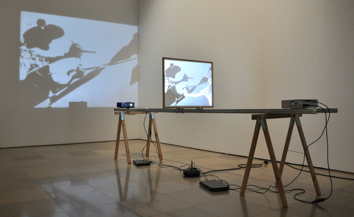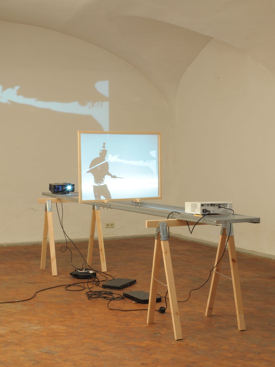 Zwei Projektionen auf eine Leinwand aus Siebdruckgewebe